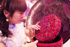 大到端莊大氣的八卦鼓桌、仿明代的卷頭幾,小到秀美的果盒、雕盤(pán),件件展品都散發(fā)著古雅之氣。據(jù)展位負(fù)責(zé)人范女士介紹,中國(guó)云雕始于唐代,由于其雕刻的圖案均為“祥云”圖形,故被稱之為云雕。“古時(shí),云雕可是只有皇帝才能享受到的珍品,它是我國(guó)現(xiàn)存的古老的手工藝術(shù)雕刻。”