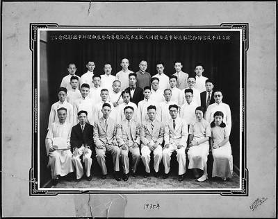 故宮文物“南遷”期間,北平故宮博物院駐滬全體同仁,攝于1935年。前排右四為院長馬衡先生。歐陽定武供圖