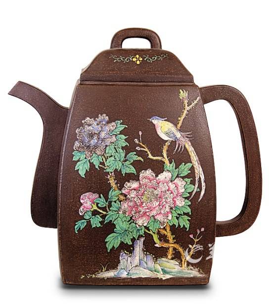 最引人注目的是一把“清代加彩四方大壺”,高約53厘米,表面繪加彩牡丹花鳥圖,用色細致,紫砂細膩,器型大方協(xié)調(diào),為清三代時期彩繪珍品。