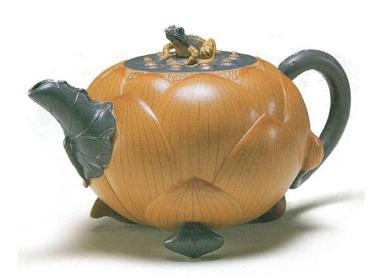 “荷花茶具”是蔣蓉大師的處女作。當(dāng)是還正是紫砂壺花貨創(chuàng)作新的萌芽時(shí)期,又逢盛夏六月,盛天的荷花,惹人喜膦,粉紅色的花瓣里裹著碧綠蓮蓬。那綽約的豐姿,高潔的品格,給人以出污泥而不染的形象,深深地吸引著人們。蔣蓉大師決定創(chuàng)作荷花茶具,這是所謂藝術(shù)上的創(chuàng)作構(gòu)思,至于實(shí)地觀察以至成型燒制,還要花很大功夫,才能成為一件人們博覽的珍品。采摘實(shí)物,凝視觀察,靜思默想是蔣蓉大師多年以來創(chuàng)作紫砂壺花貨茶具不可缺少的過程,因?yàn)樗脑煨鸵o以人們從美的享受和實(shí)用價(jià)值來琢磨。要制造荷花茶具,必須摘來荷花,蓮蓬,荷梗,荷葉,凝視觀察客觀存在的形狀,筋絡(luò),色澤,然后運(yùn)用配色,拼泥以至最后定型。蔣蓉大師以盛開的荷花作壺身,圓鼓鼓的蓮蓬作蓋,彎曲的花梗作壺把,這時(shí)候必須用大力氣精細(xì)地把模型的一筋一瓣模仿得惟妙惟肖,這說明了藝術(shù)造型的一絲不茍和嚴(yán)謹(jǐn)性。美化茶具的全身更為重要。再觀察和靜想是保證一件工藝品的造型成功。