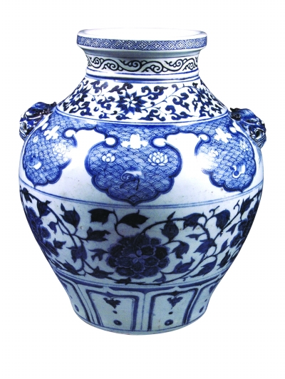 元青花纏枝牡丹海鳥獸耳大罐