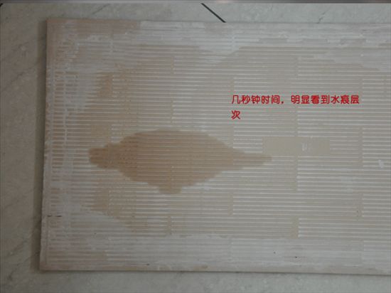 接下來,小編要來測試一下它的防水性能。把瓷片翻到背面,從左至右把水潑下去,幾秒鐘時間我們立刻看到了先接觸水的部位的水痕開始便淺,越來越淺。由于瓷片各個部位接觸水的時間都不同,所以,我們看到了依次變淺的水痕層次?梢钥闯鏊奈适呛芎玫摹!