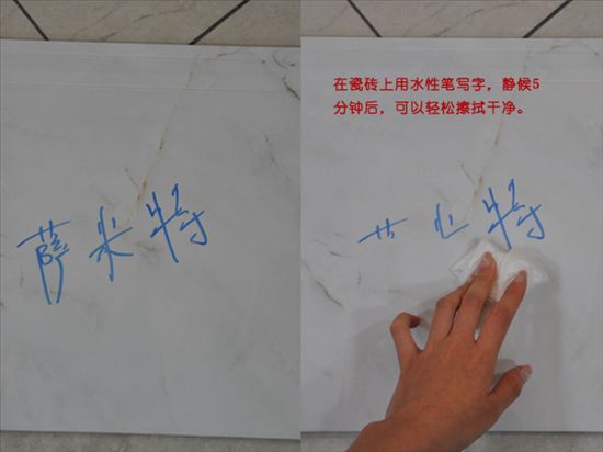瓷片的防污能力往往是消費者在購買瓷片時非常重視的一環(huán),一款防污能力強,且清洗方便的瓷片總能得到消費者的青睞。小編現(xiàn)在就來測試測試這款瓷片的奈污性,小編用水性筆在瓷磚上寫字,然后靜候5分鐘,發(fā)現(xiàn)依然可以非常輕松擦拭掉污跡,這是一款奈污能力非常強的瓷片!