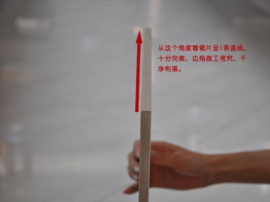 小編開始測瓷磚的邊角直度,從這個角度看過去,瓷片側面呈一條直線,非常完美。并且小編仔細觀察了瓷片的的邊角處,發(fā)現(xiàn)瓷片側平面都十分平整,看上去做工考究,且沒有任何凹凸不平處和碎料毛渣,顯得十分干凈利落。