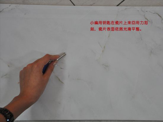 下面開始測瓷片的耐磨度,小編用鑰匙在瓷片上面用力的來回劃刻,發(fā)現(xiàn)測評表面依然平整光滑,可以得出這款瓷片的耐磨度非常好!