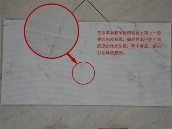 在瓷片中,最容易改變的是顏色,漂亮的造型和紋理才是一款瓷片的靈魂所在。本款瓷片顏色素雅明快,給人以一種東方的放松,寧靜的感覺。而在這個基礎上,加上一些曼妙的波浪線,仿佛在東方的內(nèi)斂中又糅合進一絲西方的浪漫;又仿佛寧靜的湖面上微風拂來,湖面泛起絲絲漣漪;讓人不禁神往。