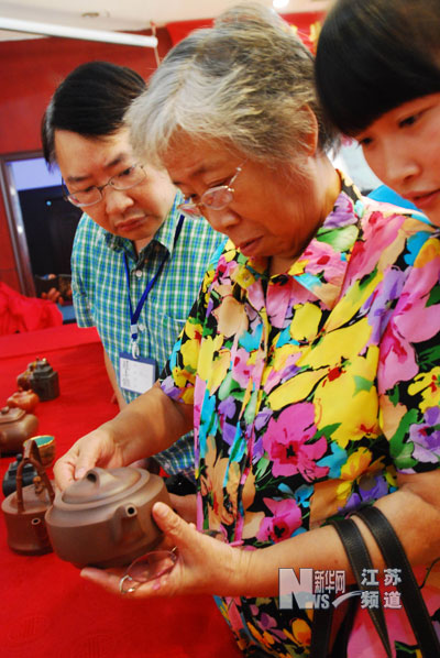 8月20日,中國(guó)工藝美術(shù)大師汪寅仙在壺友節(jié)上給“壺迷”鑒定紫砂壺。