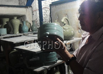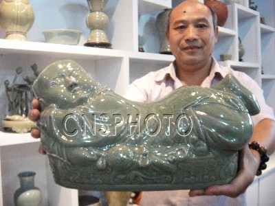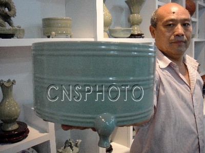 8月19日,著名陶瓷專家馬聚魁展示他新燒制的汝官瓷珍品富貴盤(牡丹圖騰)、汝瓷百子盤(石榴圖騰)、弦紋樽、孩兒枕等。河南寶豐縣汝瓷研究所所長(zhǎng)馬聚魁癡迷汝瓷研究燒制,從1976年至今,他共完成攻關(guān)課題20余項(xiàng)。其中,《寶豐紫砂陶》填補(bǔ)了河南紫砂生產(chǎn)的空白,《汝官瓷天青釉、月白釉的仿制研究》更是達(dá)到了國(guó)內(nèi)同類研究的領(lǐng)先水平。