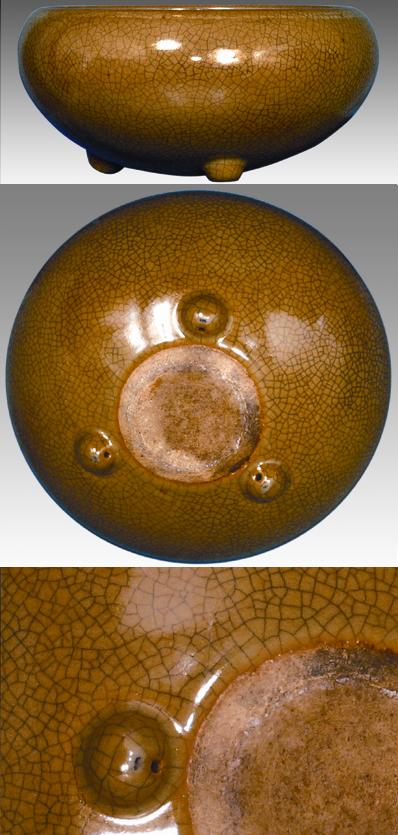 圖2、雍正景德鎮(zhèn)窯茶葉末哥釉乳足爐:器型為斂口圓弧腹?jié)u收,底承半圓狀三乳足,口徑24厘米,腹徑27.6厘米,高12.8厘米,足距10.2厘米,內(nèi)外施鱔魚黃茶葉末釉,釉色黃中泛綠似鱔魚皮,釉面勻凈肥厚、失透,起桔皮似的皺紋,并顯現(xiàn)出油膩酥光似的古舊膩光,通體片紋交織,粗紋呈墨色,紋路長縱橫全爐。細(xì)紋開片較短,顯淺紅色,形如冰裂狀,十分光潤,精美異常。外底無釉,隱約有旋紋,足端三乳足渾圓飽滿,器口施一圈醬黃釉,以示“紫口鐵足”。此爐造型淳樸、制作規(guī)整、釉色古雅,實(shí)屬雍正廠官釉之上品。