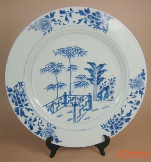 清康熙 巨型青花花卉竹紋折腰大盤(pán)