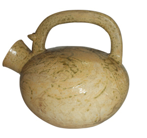 原始青瓷或稱“原始瓷器”,也稱“釉陶”、“青釉器”等。瓷器原始階段時(shí)的制品,一般認(rèn)為產(chǎn)生于商周時(shí)期。原始青瓷制品的胎體含鐵量在2%左右,經(jīng)過人工施釉,在1200℃左右的高溫中燒成。器物大多為尊、卣、簋、壺、豆、罐、鼎、杯、盂等盛器,春秋、戰(zhàn)國(guó)時(shí)也有一部分鐘、錞等仿青銅禮器。原始青瓷在浙江、江蘇、安徽等地都有發(fā)現(xiàn)。經(jīng)化驗(yàn)后證明,這些原始青瓷的瓷胎系用高嶺土燒制而成,瓷釉光潤(rùn),多施在器表及口沿內(nèi),器內(nèi)施釉的少見。其釉為以鐵的氧化物為著色劑的高溫釉,釉色以青綠為主,少數(shù)呈黃綠色或黃褐色。器物制作基本上采用輪制法,也有手捏和泥條盤筑法成形的。從瓷器的胎質(zhì)、釉料、燒成溫度及物理性能看,已具備瓷器的基本特征,但由于當(dāng)時(shí)的工藝技術(shù)水平比較低,原料粗糙,雜質(zhì)多,而且胎料的可塑性較差,胎體頗多裂紋、變形,像圖中這只提梁壺這樣造型規(guī)整的器物并不多見。這只戰(zhàn)國(guó)原始青瓷提梁壺是當(dāng)時(shí)流行于貴族階層的一種酒具,雖說裝飾略少,但外形上運(yùn)用了簡(jiǎn)潔流暢的曲線,圓滿古拙的器身上是一條纖細(xì)方形青龍為提梁,向人們展示有器型(壺身)、有線條(提梁)、有神光的威嚴(yán),有藝術(shù)的夸張,視覺上整體穩(wěn)重又不活潑,給人以精神與藝術(shù)的雙重享受,實(shí)為一件值得珍藏與欣賞的古代藝術(shù)品。