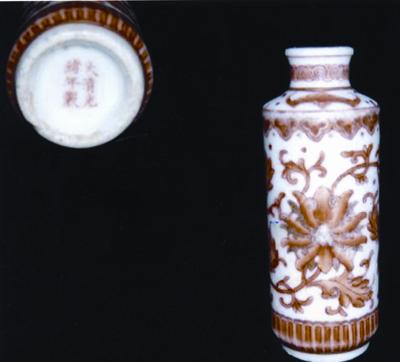 朋友鐘兄喜好收藏,在北京地區(qū)小有名氣,與我是舊交。前幾日,鐘兄打電話過來說得了一件清代光緒的鼻煙壺,要筆者幫他掌眼鑒定真?zhèn)巍S谑晴娦殖贸霾钪H特意將此物帶到我處。打開小錦盒,一件制作精致的清代光緒官窯礬紅金彩纏枝蓮小瓶(見圖)立刻躍入眼簾。瓶高8.5cm,上面細(xì)描蝙蝠、如意和纏枝蓮紋,寓意福壽吉祥,描金彩;底款楷書“大清光緒年制”,款字書寫筆畫規(guī)范有力。整只小瓶制作精細(xì),比例對稱,上面的圖案線條規(guī)矩流暢,同時(shí)金彩又為本金。根據(jù)自己多年研究古陶瓷經(jīng)驗(yàn),此瓶應(yīng)為光緒年間官窯真品,可能是當(dāng)時(shí)御藥房裝藥材器物,而非鼻煙壺。