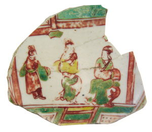 瓷器上的紋飾是那個(gè)時(shí)代的宣傳載體。手頭上有兩塊紅綠彩殘片,都是明代弘治、正德年前后的。這兩片都透露了那時(shí)的信仰和崇尚。圖1是紅綠彩孔明碗的碗心,圖2也是塊紅綠彩碗心,碗底有一個(gè)梵文字(圖3),分別傳遞出儒家思想和佛家思想。圖1畫著三個(gè)身著儒服的人,畫意應(yīng)該是“三人行必有我?guī)?rdquo;。圖中的這三個(gè)人好像是孔子、子貢和顏回。子貢對(duì)孔子說,我只能“聞一而知二”,顏回卻可以“聞一而知十”?鬃诱f:“弗如也。吾與汝弗如也。”