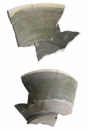 唐青釉白口碗標本(圖1)。此標本胎體灰黑,玉璧形足,碗內(nèi)有三處支釘支燒痕,口沿施較厚的白色化妝土,余部未施化妝土,最后再整體加施青釉,燒成后形成青釉白口器。從標本的玉璧足、橢圓支釘痕、器型來看這是一件唐代的產(chǎn)品。此類青釉白口器在唐代較為少見,從宋代開始多見白口器。此標本的胎土、支燒痕具有耀州窯一些唐代產(chǎn)品的特征,這種青釉白口器的白口顯然是人為故意造成這種特殊效果,青釉形成則可能與耀州窯含鐵豐富的胎土有關,或許施的是透明釉,但由于不能很好地控制胎土中鐵的成分而形成了青釉,也可能是工匠故意為之而形成的效果。