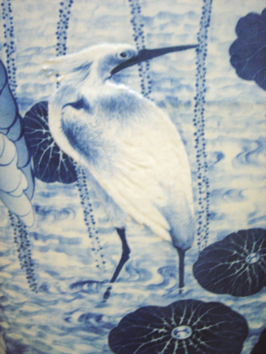 瓶頸和腹體裝飾都是分三個主要層次:上層是復(fù)式如意云首,每一云首內(nèi)繪一朵蓮花,為明洪武、清康熙云首風(fēng)格,瓶頸、腹體如一;中層為主畫面,瓶頸簡約地繪畫一周連枝葡萄,瓶腹體繪荷塘景物通景一周,為整個瓶體裝飾的主畫面;下層為復(fù)式變形蕉葉紋飾,每一蕉葉尖飾一云頭,云頭內(nèi)繪一朵蓮花。腹體主畫面所繪蓮荷的蓬、花、苞、葉含放舒卷自如,蓮荷之間繪有四只款款飛舞的蜻蜓,三只立于荷梗之上的精靈黃鶯,三只偃仰反側(cè)的鷺鷥,三只姿態(tài)各異(蹲、跳、浮游)的青蛙。整個荷塘極具縱深感、立體感,景物工寫兼?zhèn),瀟灑飄逸,栩栩如生,一派生機(jī)勃勃的景象。瓶頸的上、下口沿另外繪有云氣紋和回紋一周,使瓶頸愈發(fā)顯得富麗堂皇;腹體脛下另有一組波紋曲線和一圈連枝紋環(huán)繞。整個瓶體畫面莊嚴(yán)大方,氣象清新。