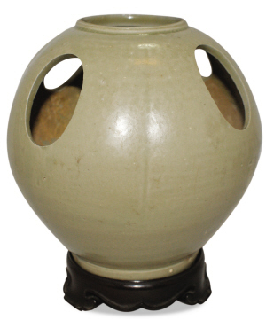 眼前這只線條流暢,釉色可人的青瓷器(見圖,高13.6厘米,圓孔4.5×3.2厘米)是我國晉代時(shí)期著名的越窯生產(chǎn)的鴨蛋形圓孔香薰器。筆者見過不少各朝各代的香薰器型, 但是像這樣的沒見過。