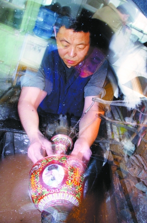 打磨先用金剛砂石水磨,目的在使成品的表面平整。所謂平整,一是銅絲跟涂上的色料一樣高低,二是色料本身也不許有一點(diǎn)兒高高洼洼。磨過以后又燒一回,再用磨刀石水磨。最后用椴木炭水磨,目的在使成品的表面光潤。椴木木質(zhì)勻凈,用它的炭來水磨,成品的表面不起絲毫紋路,越磨越顯得鮮明光滑。