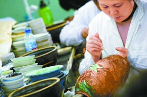 點(diǎn)藍(lán)于是輪到涂色料的工作了,他們管這個工作叫點(diǎn)藍(lán)。圖上的色料有好些種,不只是一種藍(lán)色料,為什么單叫做點(diǎn)藍(lán)呢?原來這種制作方法開頭的時候多用藍(lán)色料,當(dāng)時叫點(diǎn)藍(lán),就此叫開了。[見圖3]