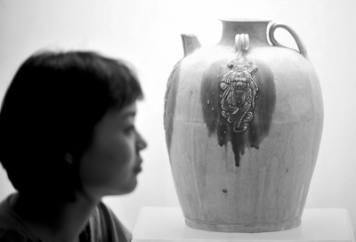 8月23日,一位參觀者正在杭州南宋官窯博物館參觀正在展出的長沙窯人物貼塑大執(zhí)壺。該壺由于器物尺寸大、存世少,俗稱“壺王”。近來,著名陶瓷鑒定專家、故宮博物院研究員楊靜榮通過媒體表示,從多個角度判斷該壺系仿品。8月23日,杭州南宋博物館接受新華社的獨家專訪,回應(yīng)媒體和部分專家關(guān)于“壺王”的真假懸疑。南宋官窯博物館稱,被質(zhì)疑的長沙窯人物貼塑大執(zhí)壺來自安徽淮北民間收藏人士丁仰振2005年的捐贈,當(dāng)年南宋博物館邀請張浦生、朱伯謙、馮小琦和朱戢等四位專家組成專家組,從丁氏提供的近千件器物中,集體選定了600余件,其中部分器物還經(jīng)過王莉英、李輝柄、李知宴、李廣寧和穆青等專家的集體鑒定。博物館稱,專家質(zhì)疑文物真?zhèn)沃皇且患抑,博物館將報上級文物主管部門對該壺及同一批征集文物再次進(jìn)行鑒定。