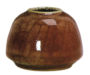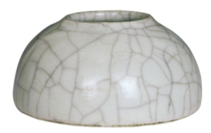 哥窯開片馬蹄形水盂(圖1),高4.5厘米,口徑2.9厘米,長(zhǎng)直口、溜肩,圓腹,平底露胎,周身碎開片,釉色瑩潤(rùn),造型優(yōu)雅。