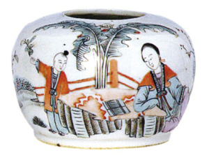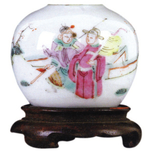 粉彩人物水盂(圖4),高6厘米,口徑2.8厘米,短直口,溜肩,圓腹,平底,腹繪粉彩人物塑制精美,人物頭戴冠帽,姿態(tài)逼真,頗富恬淡、優(yōu)美、生動(dòng)的情趣,極具神韻。