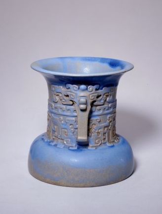 花囊撇口,粗長(zhǎng)頸,短腹,圈足。頸部凸雕饕餮紋,頸兩側(cè)置對(duì)稱獸頭長(zhǎng)鼻耳。紫砂胎,外罩乳濁的天青釉,釉汁肥厚。