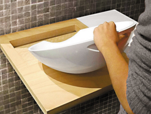 現(xiàn)代衛(wèi)生間里的面盆無(wú)論造型和功能如何多變,最起碼都是有下水口的?蛇@款面盆則是采用了一種返璞歸真的設(shè)計(jì),下水口沒(méi)有設(shè)計(jì)在內(nèi)部反而是安排在了面盆 的前側(cè),而面盆本身的造型可以方便使用者輕松地將其抬起并倒出廢水,為了防止廢水亂濺,它的下水口還被設(shè)計(jì)成了一道狹長(zhǎng)的縫隙。通過(guò)手動(dòng)倒水、“制造麻 煩”的方式來(lái)達(dá)到節(jié)水的目的。