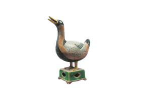 李一平介紹,該器模制,分上下兩截。鴨頸中空與口相通,腹部合縫處子口上勻布六個隱孔,空氣可從隱孔進入腹內(nèi),并與張的鴨嘴對流。它比將對流孔設(shè)在鴨背的東周曾侯乙墓鴨形香盒、宋銅器鴨熏、宋影青釉瓷鴨熏更為巧妙美觀。