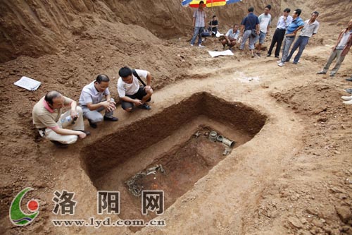 29日下午,記者隨市文物工作隊工作人員一起來到該墓葬的發(fā)掘現(xiàn)場:瀍河回族區(qū)唐寺門附近的洛陽榮康醫(yī)院新址建設(shè)工地,墓葬位于該工地的東南方向,幾名工作人員正在對墓葬進(jìn)行清理。我們看到,該墓葬距地面約7米,坐北朝南,長約3.2米,寬約1.6米;墓葬形制為西周時期比較常見的豎穴土坑墓,墓室中部略低于墓底,有一腰坑。由于年代久遠(yuǎn),墓內(nèi)的棺材已經(jīng)碳化,只在墓室周圍留下黑色的痕跡。從痕跡分布情況看,棺材呈梯形,北部寬1米、南部寬1.2米,長約2.4米;放置在棺材內(nèi)的墓主人尸骨已經(jīng)碳化,只在墓室底部留下一些紅色的碳化痕跡,仔細(xì)辨認(rèn),能大致看到人形模樣。在墓室的北部,靠近墓主人頭部的地方,放置著幾件保存完好的青銅器,分別為一爵、一鼎、一簋、一觚、一戈,另外還有一件陶鬲,但已經(jīng)破碎。尤其值得一提的是,工作人員在簋的底部還發(fā)現(xiàn)有至少五個字的銘文。