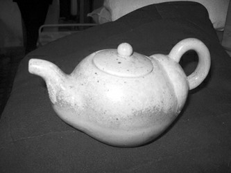 眼前,一把油亮亮、光閃閃,色澤、造型都特別奇怪的茶壺(左圖),黃褐色調(diào)中夾雜著少許奶油基色的茶壺,仔細品鑒這把茶壺的材質(zhì)不是紫砂,不是瓷器,更不是用石頭雕刻的。在場的幾位藝術界朋友欣賞過后認為此壺的設計思路大有新思路。“這是我最近新創(chuàng)作的‘紅頂商人’日本古陶茶壺。這與傳統(tǒng)的紫砂壺有什么不一樣?”上海著名抽象派油畫家彭鳴亮說道。
