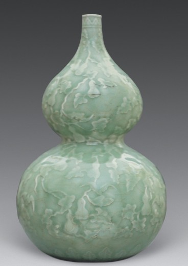 明以前微近黃色,至清代純近綠色。其釉色為青中泛黃,釉面光澤,比粉青、梅子青弱。明代豆青色釉燒制水平趨于平穩(wěn),基本色調(diào)仍以青中閃黃為主,而青色比以前淡雅。清代豆青釉淡雅柔和,色淺者淡若湖水,色深者綠中泛黃,色深如翡翠,釉面凝厚。清代豆青釉也常作地色,在豆青上加彩二次入窯燒成,淡雅的釉色襯托下的色彩,更加艷麗嫵媚。清代中期以后,豆青色釉還有的在素胎上勾勒出紋飾輪廓線,施以豆青釉,然后入窯燒造成凸起的紋飾。豆青釉透明度不及白釉,故豆青釉青花的效果也不及豆青釉釉上彩效果好。