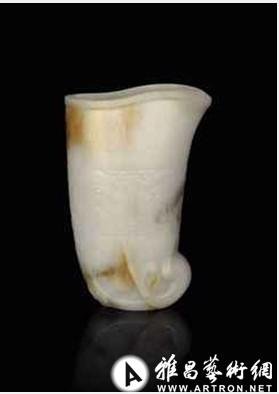 時(shí)至十八世紀(jì),好古慕雅之風(fēng)在清廷經(jīng)久不衰?涤焊扇⑹,君主皆汲汲于搜求古董文玩,對于用當(dāng)代材質(zhì)制成的仿古器物,他們亦青睞有加。拍品中有一對讓人贊嘆不已的白玉杯配花菱形盞托 (拍品1021號),其鐘型杯身光素?zé)o紋,乍看之下,似乎與仿古器物毫無關(guān)聯(lián)。其實(shí),其托盤精致的菱式造型,可上溯至漢代漆器及年代略晚的金銀器。眾多精品中,尚有一件較為明顯的仿古之作,即珍罕之至的黃玉仿古觥 (拍品1017號)。玉匠采用了上乘的黃色美玉,并師法青銅器形,將之琢成古意盎然的玉觥。工匠已盡量避免在器身浮雕紋飾,藉以突顯石材的天然色澤。觥身唯一的裝飾是其精美的仿古卷草形柄,下承小巧玲瓏的仿古鳳凰,其蓋頂?shù)木聿菁y裝飾襯以螭龍。白玉仿犀角饕餮紋杯 (拍品1018號) 亦屬仿古器物,其構(gòu)思之妙讓人嘆為觀止。此杯形制敦碩,雕琢細(xì)膩,器身下半部狀似枝葉繁茂的卷草,造型儼若盞托。杯身大體光素,僅在器腰淺雕饕餮紋一匝?偟膩碚f,此杯糅合了仿古器物的兩大特征:其形制脫胎于古代角雕,而饕餮紋飾則是師法古青銅器。
