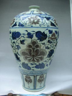 元代釉里紅瓷器:由元代江西景德鎮(zhèn)創(chuàng)燒。元代釉里紅大多呈灰黑色,少量紅色器物以青花蓋碗、罐、玉壺春瓶居多。裝飾簡單,有纏枝蓮、草葉紋等。明洪武朝釉里紅較為盛行,呈色淺紅而帶灰色。裝飾以線描為主,紋飾有纏枝菊紋、纏枝蓮等。