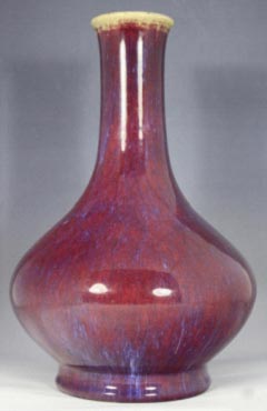清代窯變釉品種主要是仿鈞釉和爐鈞釉。這個(gè)時(shí)期茶具盛行,也與當(dāng)時(shí)的康熙、乾隆兩位皇帝經(jīng)常江南巡游有密切關(guān)聯(lián),各地方官員均呈仿鈞釉即仿宋代鈞窯的釉色的茶具、瓷器。爐鈞釉始于雍正朝,最低溫釉。制作時(shí),先高溫?zé)脻ゴ桑偈┯,最后?00°C~900°C的爐內(nèi),兩次燒成。因它的釉是二次入爐燒成的,且釉面仿宋代鈞窯窯變,故名。爐鈞窯瓷多見(jiàn)于清雍正、乾隆兩朝。指在坯體上施兩次含鐵鈷呈色元素的釉料。清雍正時(shí)景德鎮(zhèn)窯仿鈞窯的新品種。清《南窯筆記》說(shuō):“爐鈞一種,乃爐火中所燒,顏色流淌中有紅點(diǎn)者為佳,青點(diǎn)次之。”傳世的爐鈞釉瓶、尊等器中青藍(lán)色者居多,紅點(diǎn)者較少見(jiàn)。