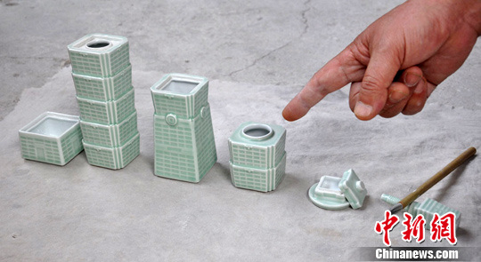 9月6日,江西省景德鎮(zhèn)民間陶藝家張茂生展示臺灣101大樓陶瓷文具