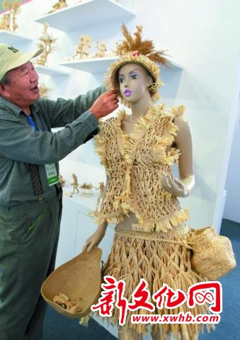 瓷器展位東側(cè),一位身穿草編舞蹈服的樹脂模特做起了迎賓員,這里就是草編展位。