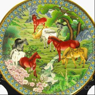 景泰藍是我國金屬工藝品中的重要品種。制作景泰藍先要用紫銅制胎,接著工藝師在上面作畫,再用銅絲在銅胎上根據(jù)所畫的圖案粘出相應(yīng)的花紋,然后用色彩不同的琺瑯釉料鑲嵌在圖案中,最后再經(jīng)反復燒結(jié),磨光鍍金而成。景泰藍的制作既運用了青銅和瓷器工藝、又溶入了傳統(tǒng)手工繪畫和雕刻技藝,堪稱中國傳統(tǒng)工藝的集大成者。這種銅的琺瑯器創(chuàng)始于明代景泰年間,因初創(chuàng)時只有藍色,故名景泰藍。現(xiàn)代景泰藍已變成了一種工藝品名稱,而不是顏色了。