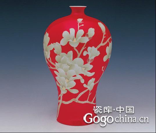 圖:紅瓷手繪玉蘭繽紛梅瓶陶瓷藝術(shù)花瓶