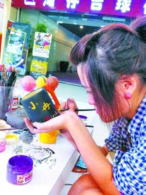 在農(nóng)業(yè)路寶龍廣場內(nèi)的一家陶吧里,琳瑯滿目的陶藝DIY手工藝品擺在櫥窗里,完全沒有從機(jī)械模出來的單調(diào),手劃的色條,也沒有了機(jī)印上去的乏味,好看、有趣得讓人愛不釋手。這些獨(dú)特好看的作品像一雙雙搖擺的手,無時(shí)無刻不在吸引著你的注意。再加上店內(nèi)的輕音樂,一股雅致的氣息油然而生。
