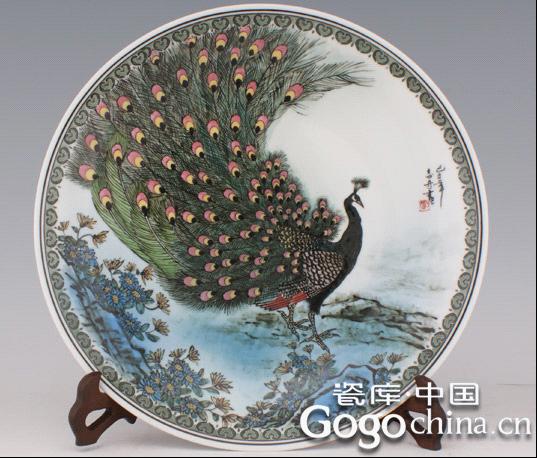 圖:釉下五彩大師手繪孔雀圖寒江凝翠陶瓷藝術(shù)掛盤