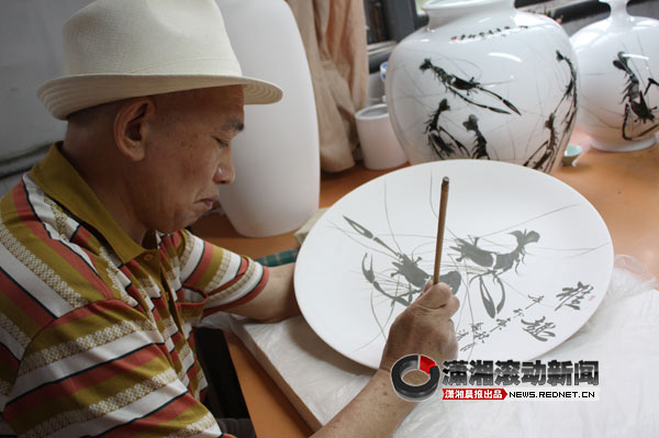 (9月19日,醴陵元詔瓷業(yè)公司,中國(guó)書(shū)畫(huà)家鐘喬清在瓷胚上現(xiàn)場(chǎng)畫(huà)蝦。