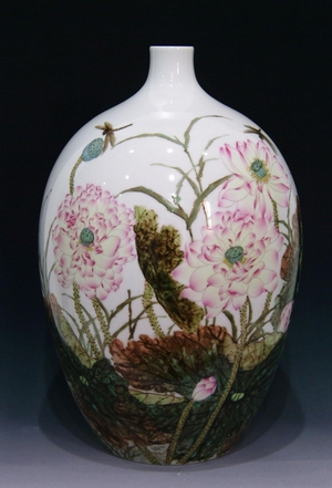 粉彩是景德鎮(zhèn)窯在五彩的基礎(chǔ)上及“琺瑯彩”的影響下創(chuàng)制成功的又一種彩瓷。它的獨(dú)特之處,是在彩繪時(shí)攙加一種白色的彩料“玻璃白”。“玻璃白”具有乳濁效果,畫出的圖案可發(fā)揮渲染技法的特性,呈現(xiàn)一種粉潤(rùn)的感覺(jué),因此被稱為“粉彩”或“軟彩”。其作法是用經(jīng)過(guò)“玻璃白”粉化的各種彩料,在燒成的白釉瓷器的釉面上繪畫,經(jīng)第二次爐火燒烤而成。粉彩初創(chuàng)于康熙晚期,盛燒于雍正、乾隆,成為清代瓷業(yè)生產(chǎn)的一個(gè)主要品種。直到現(xiàn)代,景德鎮(zhèn)的許多瓷廠仍繼續(xù)生產(chǎn)。