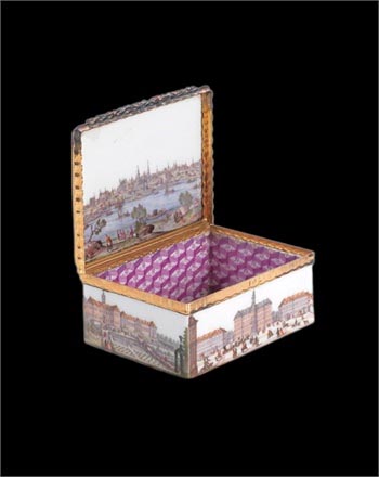 舊時,這如寶石般的珍貴鼻煙盒常以禮物的形式贈予王子,君主及外交官。有時候還會專為王子及公主們專門定做。系列里最昂貴的是一件受到了Bernardo Bellotto的雕刻作品而啟發(fā),蓋內(nèi)雕刻有精細的德累斯頓市貌的作品。整個系列估計市值為一百萬英鎊左右。