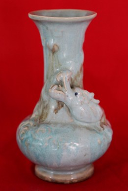 宋汝窯龍瓶通高22.5cm,腹徑13.5cm,底徑8.5cm。腹扁而圓,堆塑的龍模印而成。角似鹿角,足卷曲外撇(呈八字型)的特征。龍尾位于瓶口,旋轉(zhuǎn)于瓶腹部,頭向上,張口朝立體的一顆寶珠和二團(tuán)火。龍的上顎唇較長而往上翹起,上下顎各有二顆牙,尖而內(nèi)扣,舌小而尖如戟。龍的周圍有立體狀七朵靈芝狀的云朵,再加上天青粉青釉及二十多條淚痕,如波浪濤天的大海,龍從海中沖上天。像征著“九龍吸珠”,顯示出龍可上天入海的神威。