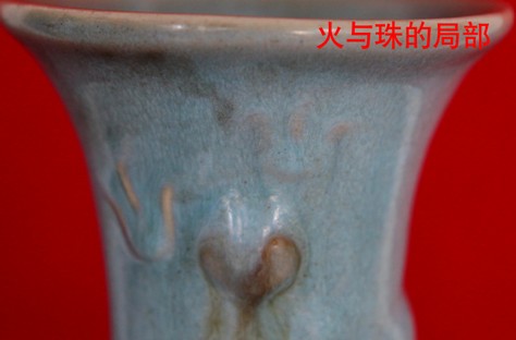 用三十倍放大鏡2平方厘米,可見2-3個(gè)氣泡,正如古書記載汝瓷氣泡“廖若晨星”,并可見瑪瑙在釉中的結(jié)晶體,如夜空星星,均勻密布,十分美麗,特別瓶下半部,結(jié)晶體更大密積。