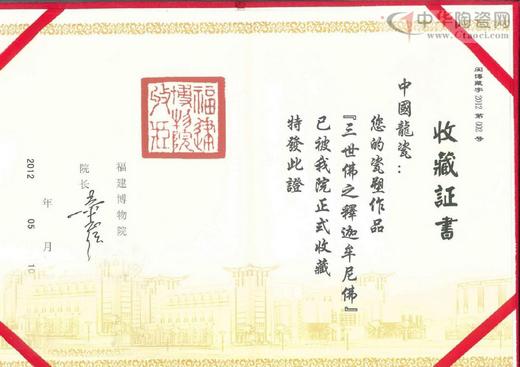 該作品榮獲2011中國(北京)禮品交易會暨國務(wù)政務(wù)禮品、大師精品展評比“銀獎”及首屆“大地獎”陶瓷作品評比“銅獎”,日前被福建省博物院永久收藏。