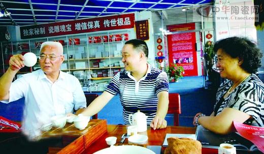 在中國白藝術宮品賞“仁海斗茶壺”時,何天雄(左一)連聲贊嘆德化陶瓷把思想、內涵、文化、藝術和智慧都融入到陶瓷藝術之中