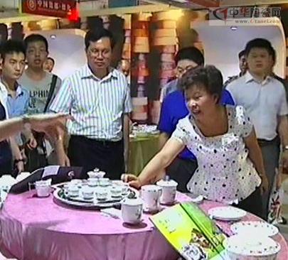 【同期聲 福杰陶瓷有限公司內(nèi)銷業(yè)務員 張光華:這是我們公司新推出的一塊富貴吉祥轉盤茶具,它可以傳動,讓顧客使用起來更方便。】