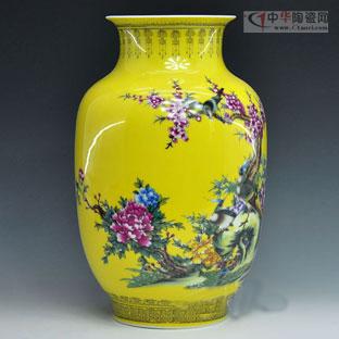 圖:帝王黃瓷粉彩富貴花香高檔花瓶