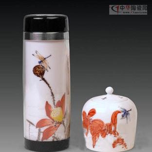 圖:景德鎮(zhèn)瓷器名家手繪紅彩荷花陶瓷雙層保溫杯